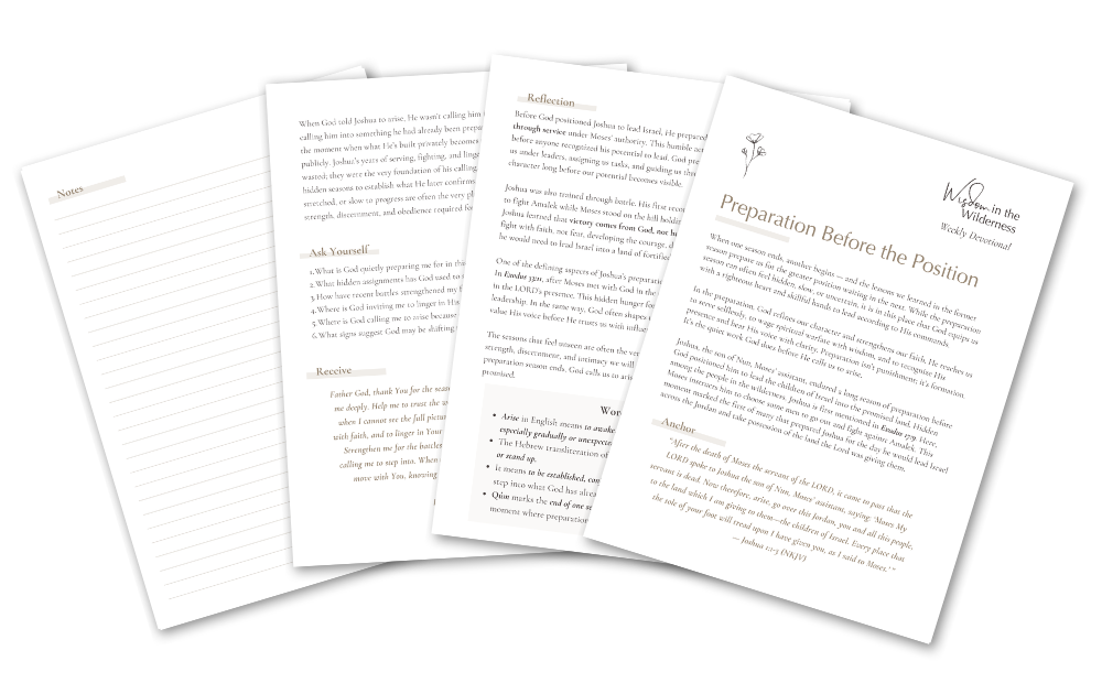 Preparation Before the Position is a four-page devotional that explores God’s command for Joshua to arise and go in Joshua 1:1-3. Well before God positioned Joshua to lead, He prepared him in quiet, humble seasons. As you read, you’ll gain a deeper understanding of how God prepares us before calling us to arise and step into the assignment He has prepared for us.